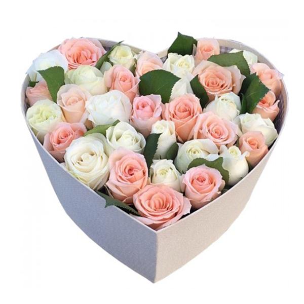 35 розовых и белых роз в коробке в форме сердца