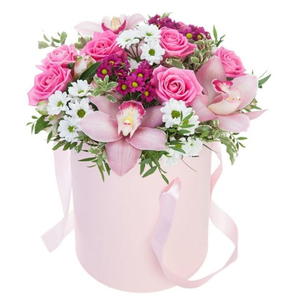 Смешанный букет розовых цветов в коробке
